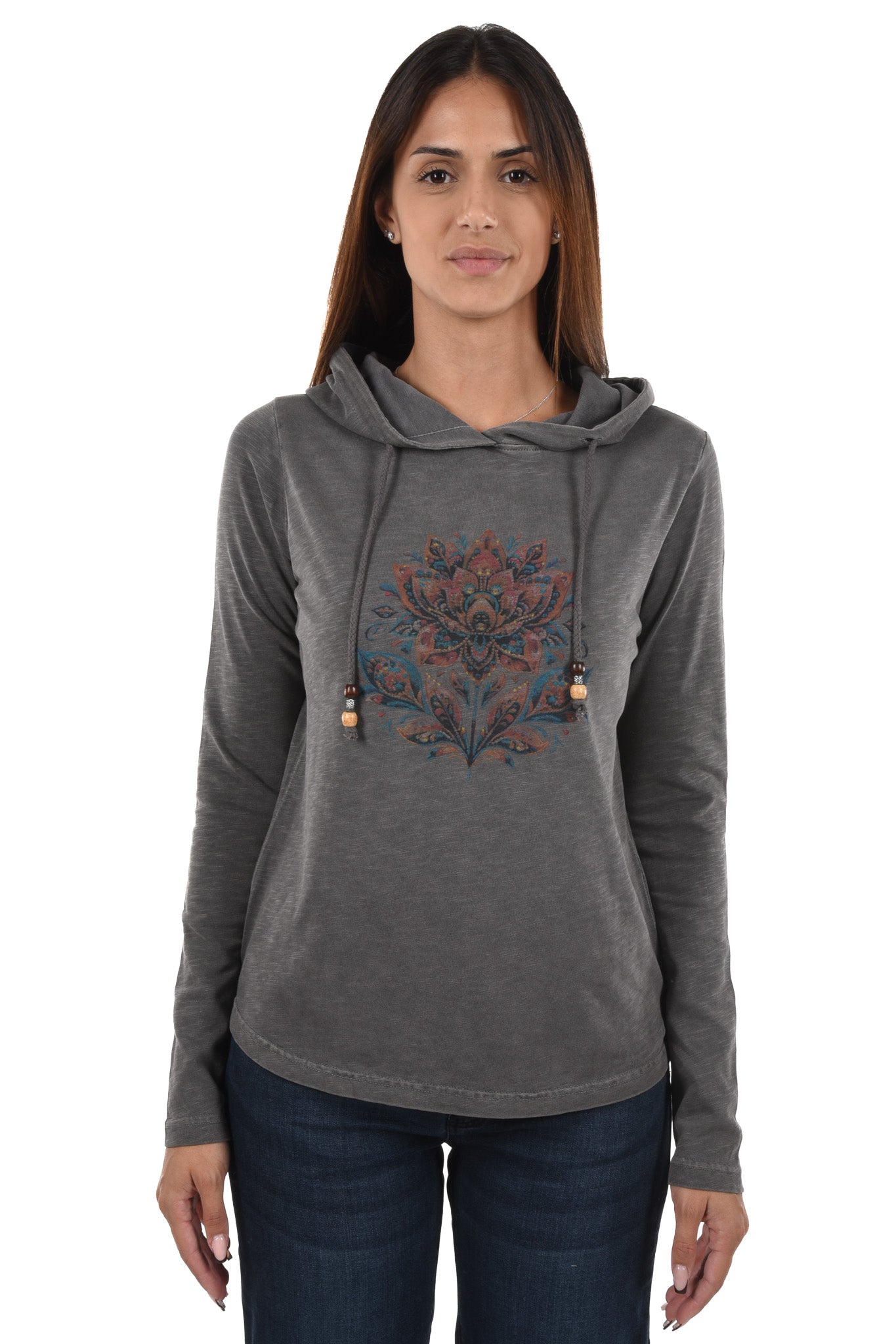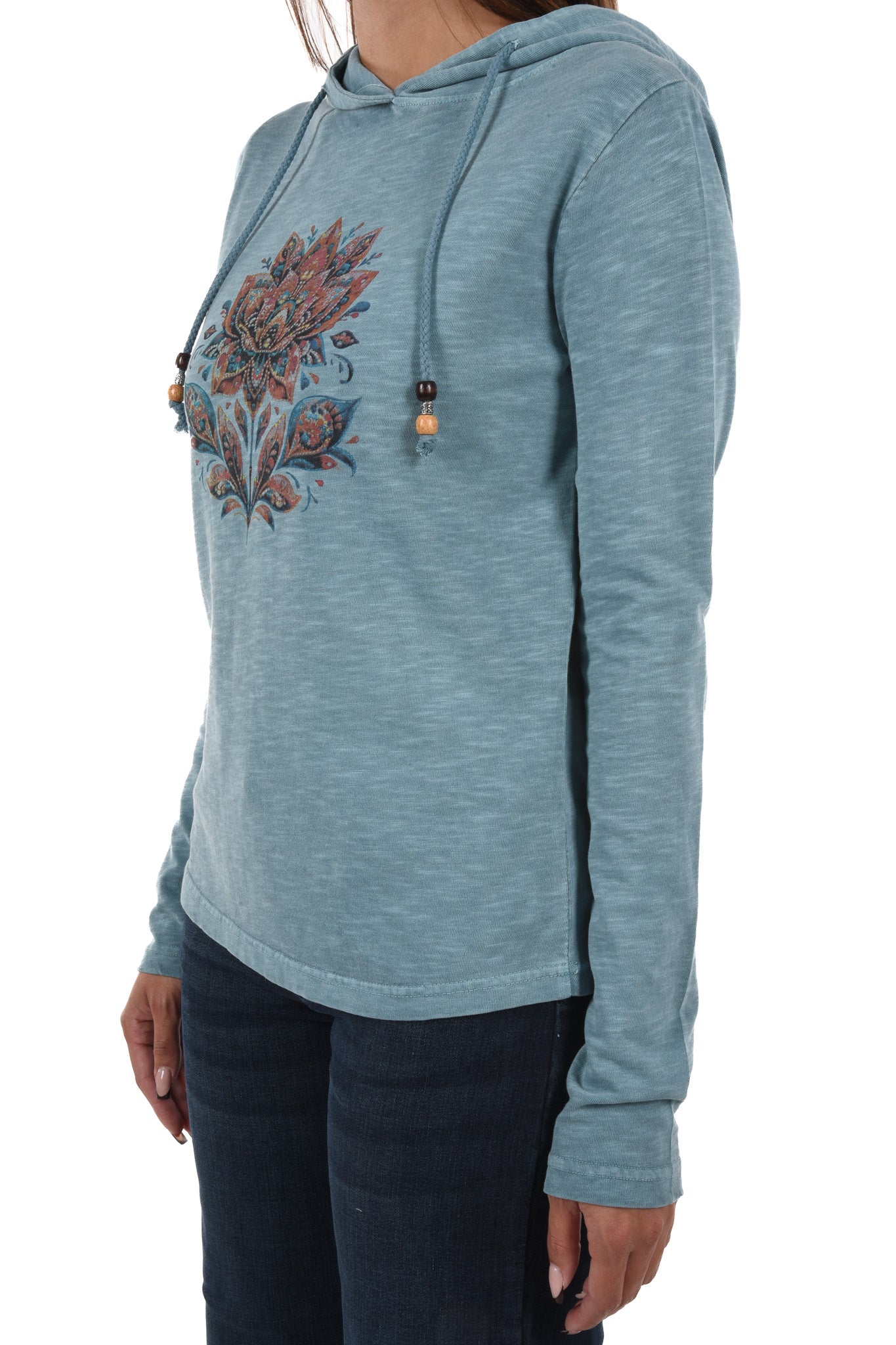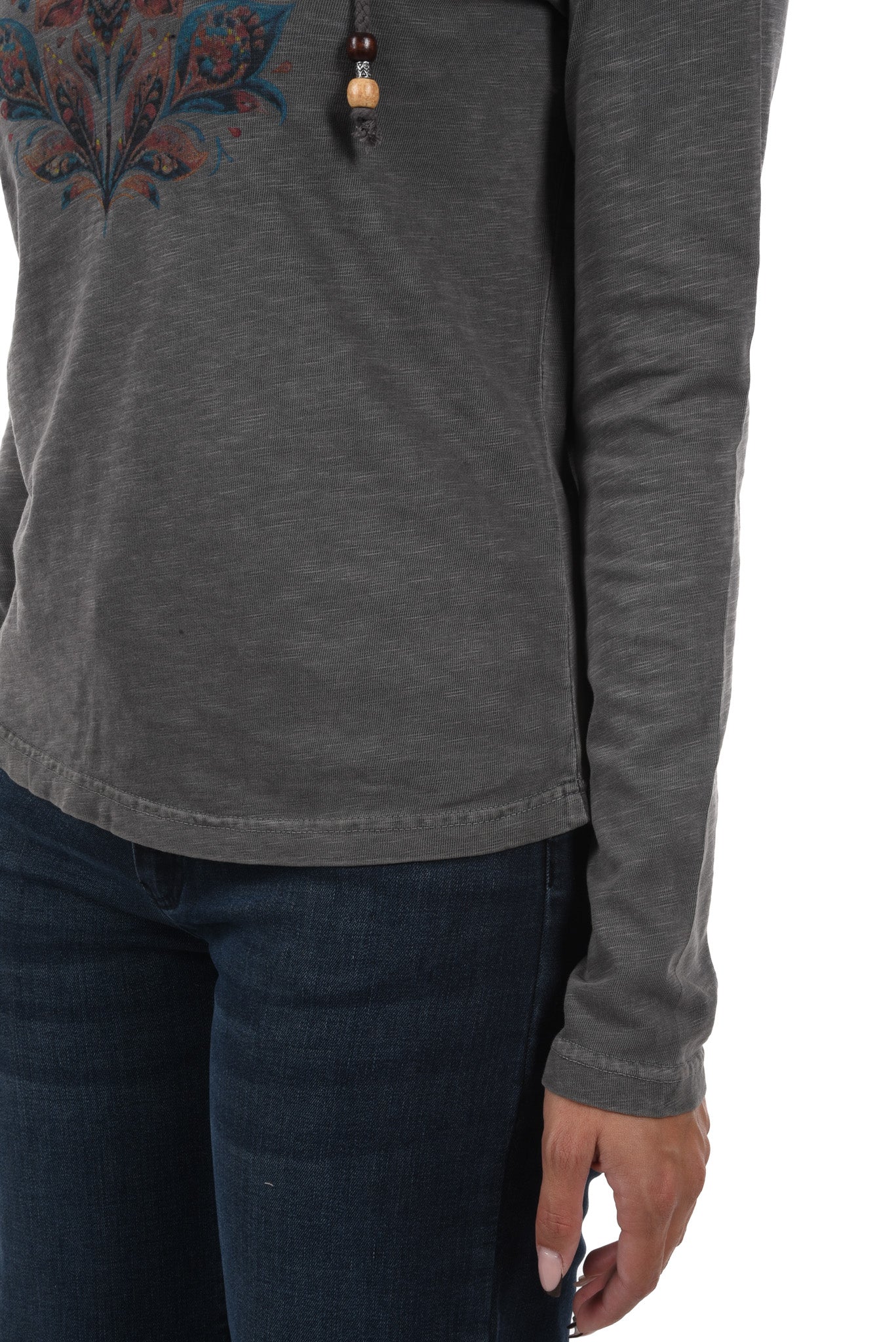 Notre mannequin mesure 172cm et porte une taille 27 Inch pour le jeans et une taille S pour le haut
