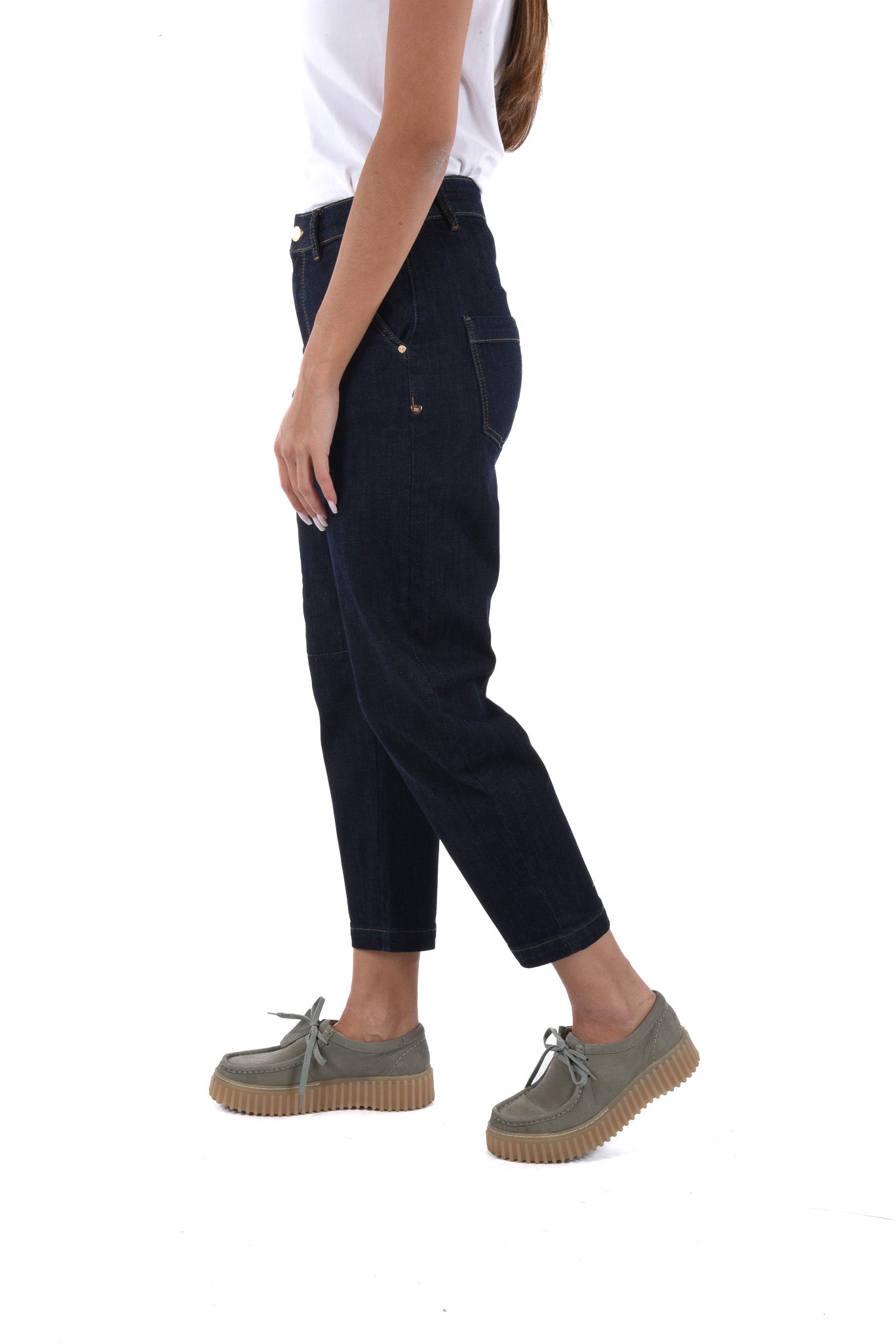 Unser Model ist 172 cm gross und trägt bei den Jeans Grösse 27 Inch und bei Oberteilen Grösse S