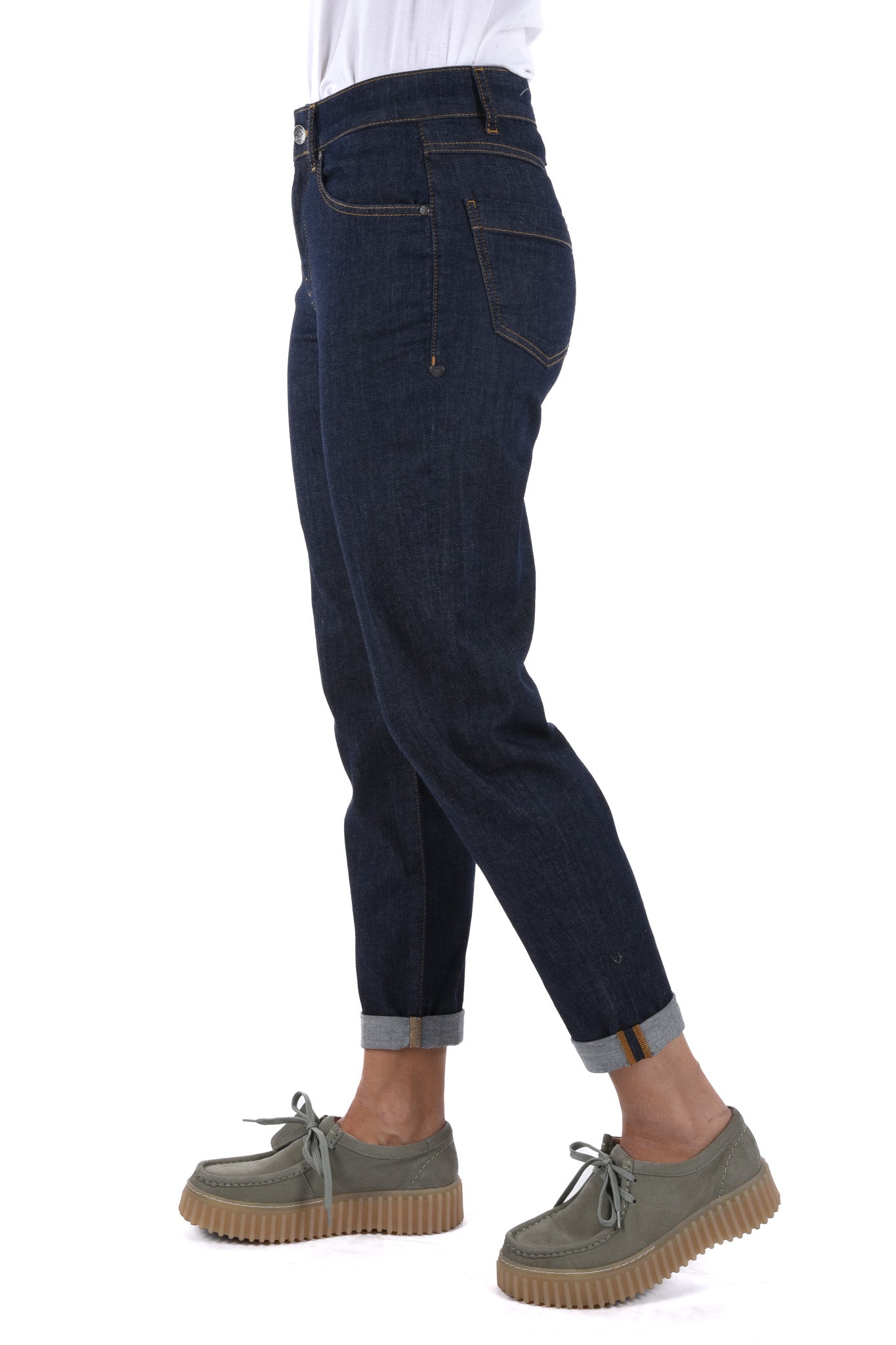 Unser Model ist 172 cm gross und trägt bei den Jeans Grösse 27 Inch und bei Oberteilen Grösse S