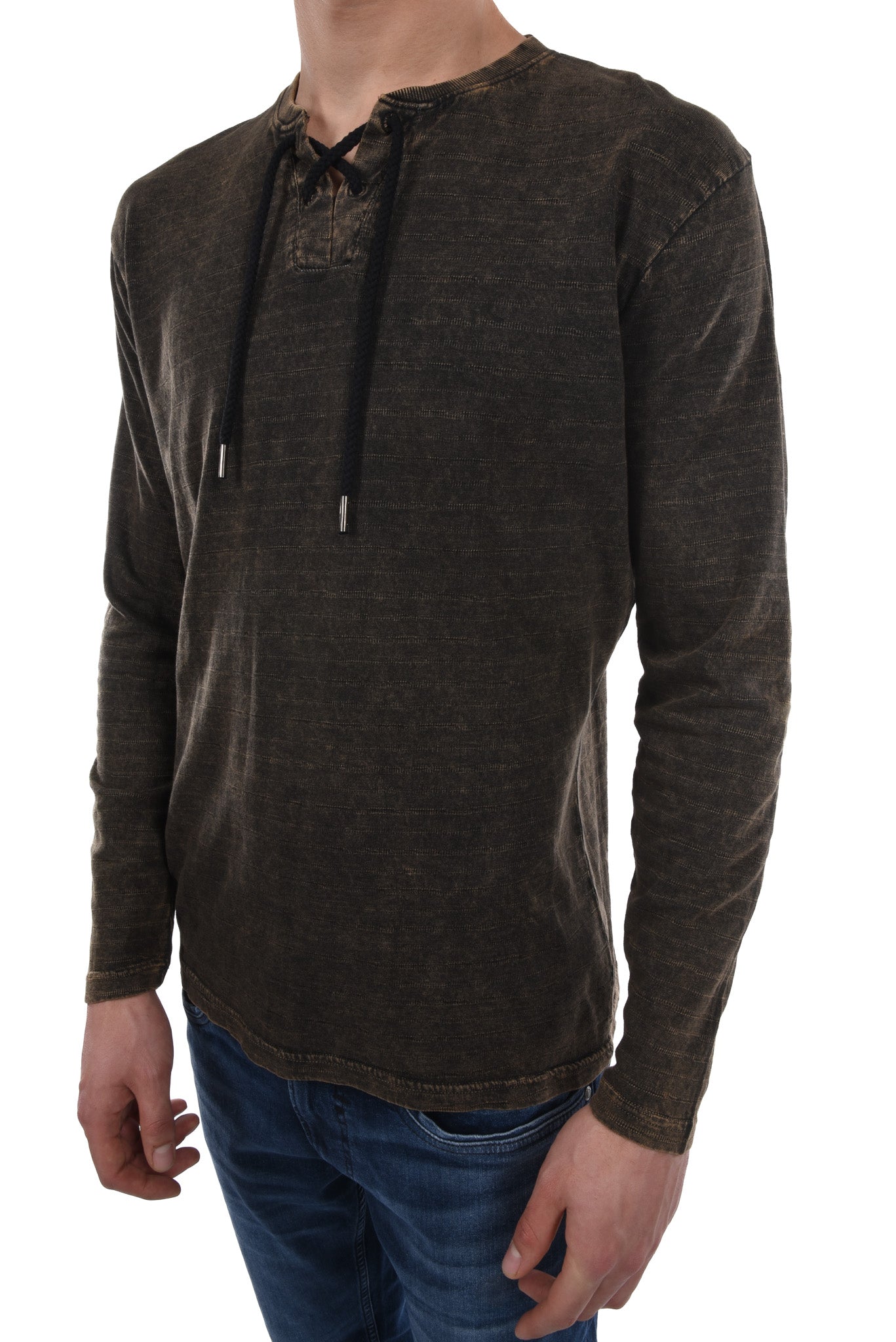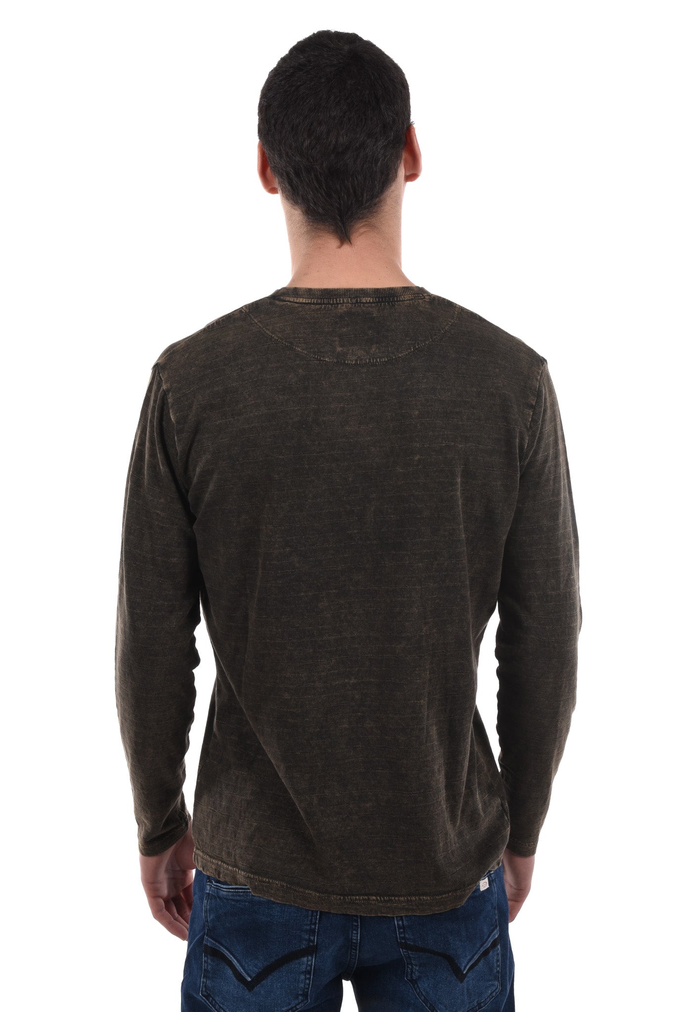 Unser Model ist 186 cm gross und trägt bei den Jeans Grösse 32 Inch und bei Oberteilen Grösse M