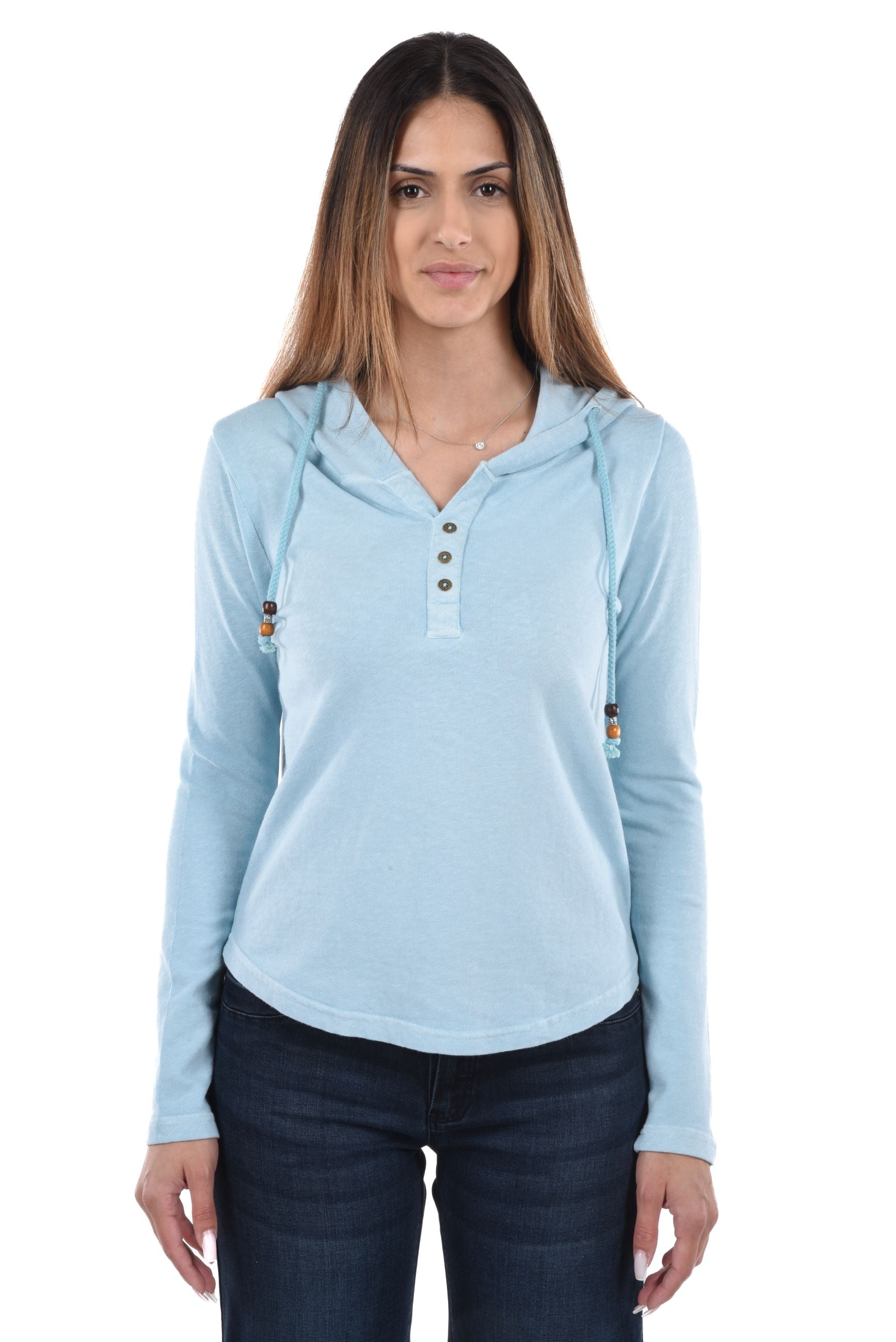 Unser Model ist 172 cm gross und trägt bei den Jeans Grösse 27 Inch und bei Oberteilen Grösse S