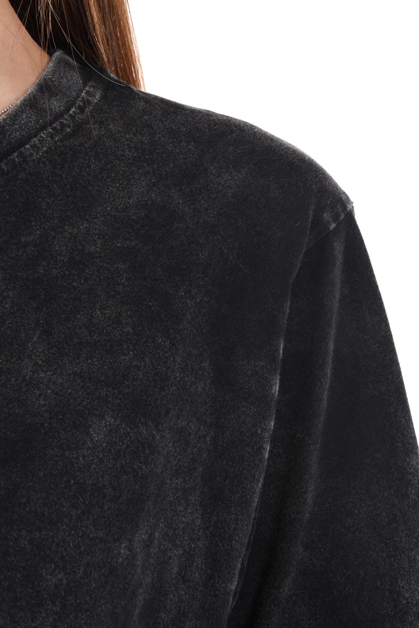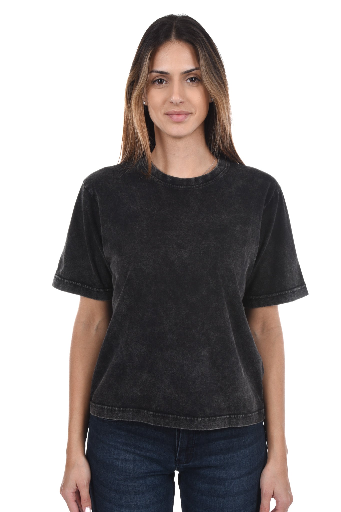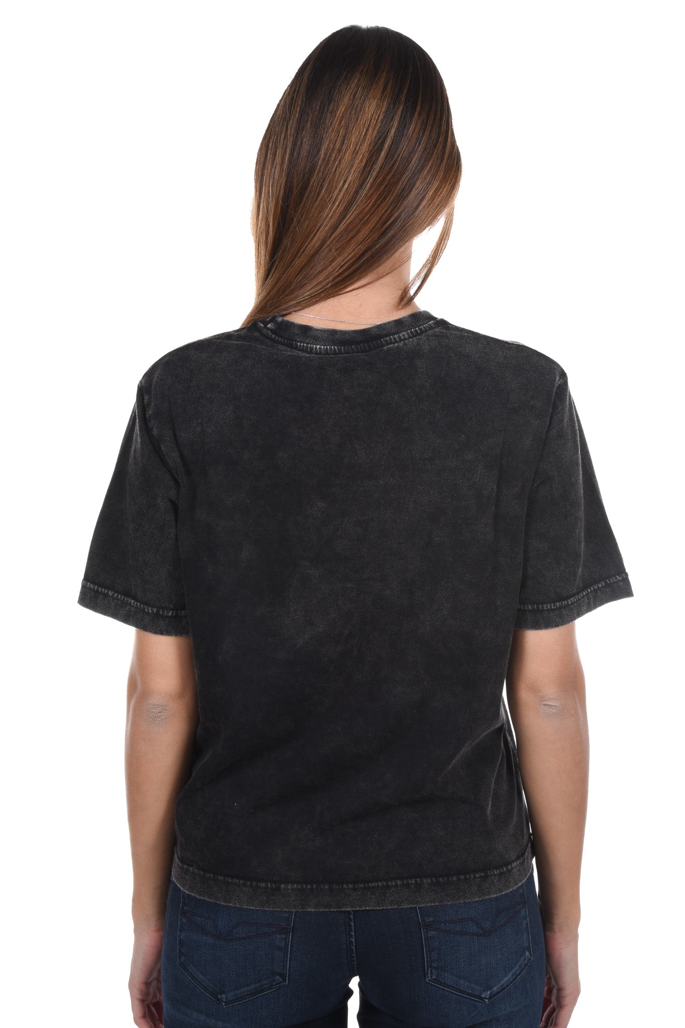 Unser Model ist 172 cm gross und trägt bei den Jeans Grösse 27 Inch und bei Oberteilen Grösse S